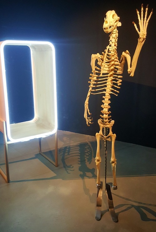 Poursuivons la visite, si vous le voulez bien. Bousculant « les frontières entre humains et non-humains », la bio-artiste Marion Laval-Jeantet s’est un jour injectée du sang de cheval dans les veines. À Saint-So, elle présente un squelette de chien, positionné debout comme un humain, sur des pattes bioniques. Le canidé profiterait « des dernières innovations ‘transhumanistes’ […] augmentant ses propres capacités. » Dans une salle sombre, décorée de trois pots de fleur et d’une guirlande lumineuse achetée chez Zeeman, l’artiste « éco-queer » Zheng Bo élargit « la sexualité aux relations humains-plantes ». Sa vidéo présente un homme copulant avec une fougère. Puisque le propos est de défendre l’égalité végétaux-humains, et que l’artiste n’a pas demandé son consentement à Mme la Plante, cela s’apparente-t-il à un viol de fougère ? L’artiste et ingénieur Fabien Léaustic, employé d’un labo d’« ingénierie cellulaire et génique », replace « l’espèce humaine sur un pied d’égalité avec les autres membres de la grande famille du vivant. » Autour de tubes à essai, des mains tripatouillent des brins d’ADN de plantes et d’humains qu’il fusionne avec des machines. Comme dans une vulgaire multinationale de semences transgéniques.